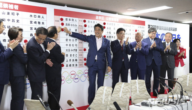 전체 의석수 가운데 절반인 124석에 대해 실시된 이날 참의원 선거에서 자민·공명당은 67석을 획득할 것으로 전망됐다.