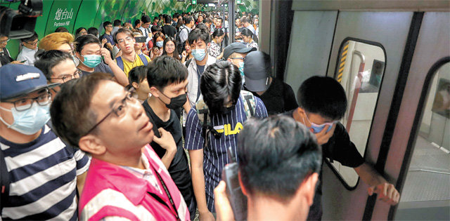 지하철 ‘게릴라 시위’ 5일 ‘범죄인 인도 법안’에 반대하는 시민들의 주도로 대규모 총파업이 벌어진 홍콩에서 마스크를 쓴 시위대가 홍콩 지하철(MTR)의 운행을 방해하고 있다. 20개 산업에서 50만 명 이상의 시민들이 동참한 이번 시위로 열차 운행이 금지되고 도로가 점거돼 홍콩 시내 곳곳이 마비됐다. 홍콩=AP 뉴시스