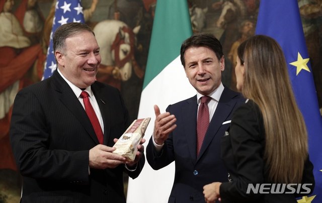 AP통신, 워싱턴포스트(WP)에 따르면 이날 폼페이오 장관은 로마에 위치한 총리 관저에서 주세페 콘테 이탈리아 총리와 만나 악수를 나누며 기념 촬영에 나섰다.