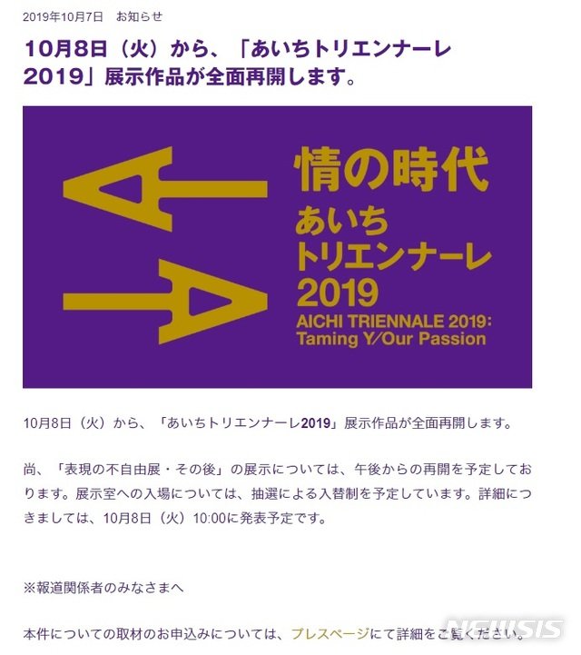 8일 NHK 등 일본 언론은 아이치(愛知)현 국제예술제 ‘아이치 트리엔날레’의 기획전인 ‘표현의 부자유전’의 전시가 이날 오후 재개된다고 보도했다.