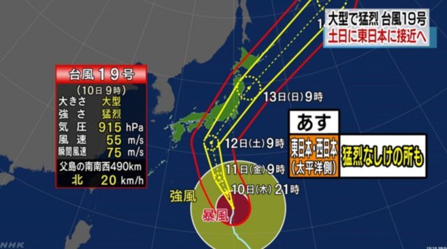 제19호 태풍 하기비스가 강한 세력을 유지한 채 일본 열도로 접근하고 있다. 일본 기상청은 태풍이 수도 도쿄(東京)를 비롯한 동부지역을 강타할 것이라며 기록적인 폭우가 예상된다고 경고했다.