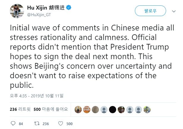 중국 공산당의 대변인 역할을 하고 있는 후시진 환구시보 편집국장은 자신의 트위터를 통해 “트럼프 대통령이 다음 달 무역협상안에 서명하기를 원한다는 소식을 주요 매체들이 전혀 보도하지 않았다”며 “이는 베이징이 아직도 불확실성이 크다고 인식하고 있으며, 대중의 기대를 너무 높이는 것을 원치 않기 때문”이라고 분석했다.