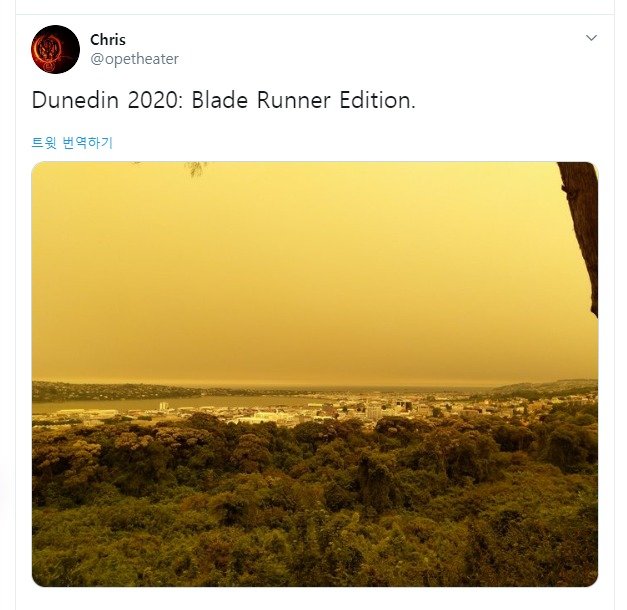 1일(현지시간) 뉴질랜드 남동부 항구도시 더니든의 하늘이 누렇게 변해버렸다.(출처 = 트위터) © 뉴스1
