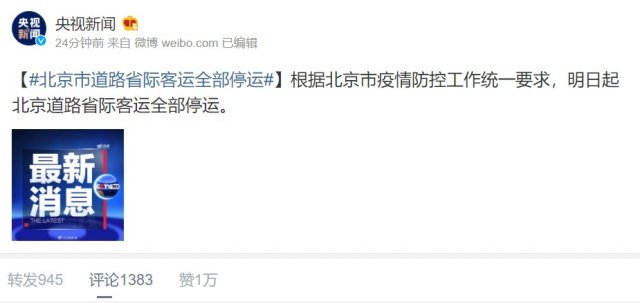 25일 중국 중앙방송(CCTV)은 “베이징의 전염병 예방 및 통제 차원에서 내일(26일)부터 베이징 도로를 통한 모든 여객 운송을 전면 중단한다”고 보도했다.