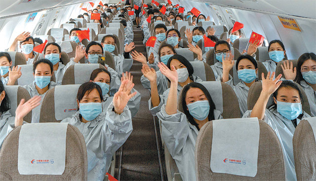 우한 파견 의료진 “집으로 돌아갑니다” 신종 코로나바이러스 감염증(코로나19)의 발원지인 중국 후베이성 우한에 파견됐던 중국 의료진이 18일 톈허 공항에서 고향으로 돌아가는 전세기에 탑승해 손을 흔들고 있다. 이날 후베이성에서는 코로나19 발병 이후 3개월 만에 처음으로 추가 확진자가 나오지 않았다. 우한=신화 뉴시스