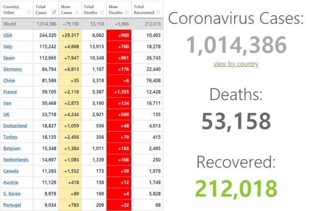 3일 오전 9시20분(한국시간) 실시간 국제통계사이트 월드오미터에 따르면, 전 세계 코로나19 누적 확진자수는 101만4386명이다. 사망자는 5만3158명, 치명률(사망자수/확진자수)은 약 5.2%다.