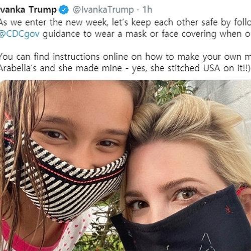 도널드 트럼프 미국 대통령의 장녀 이방카 트럼프 백악관 선임보좌관(오른쪽)이 딸 아라벨라 쿠슈너와 함께 마스크를 쓴 사진을 12일(현지 시간) 트위터에 올렸다. 그는 “공공장소에서 마스크 등 안면 가리개를 사용하라는 질병통제예방센터(CDC)의 권고를 지키자”고 썼다. 아라벨라가 만든 이방카의 마스크에는 ‘USA’란 자수가 수놓아져 있다.