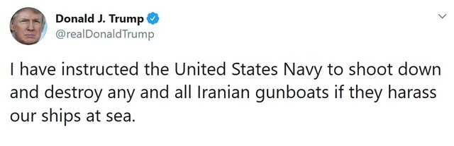 트럼프 대통령은 이날 트위터에서 “나는 미 해군에 이란 포함들(gunboats)이 바다에서 우리 선박을 괴롭힐 경우 모두 쏴서 파괴하라고 지시했다”고 주장했다.