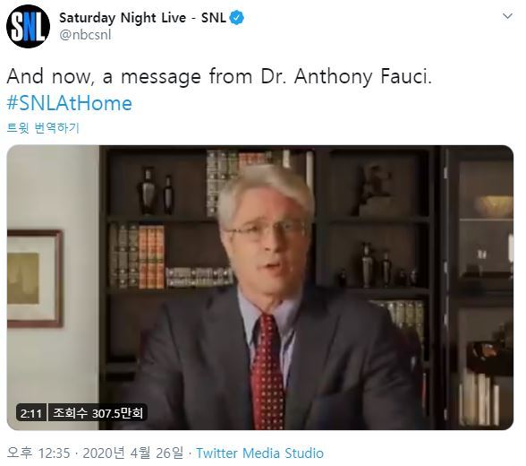 마지막에 피트는 가발과 안경을 벗은 후 “진짜 파우치 박사에게 ‘이런 불안한 시기에 당신의 차분함과 투명함이 있어 다행’이라고 감사하고 싶다. 코로나19 최전선에 있는 의료진과 그들의 가족에게도 고맙다”고 강조했다. 2016년 대선에서 야당 민주당의 힐러리 클린턴 후보를 지지한 피트는 평소에도 트럼프 대통령에 비판적인 반(反)트럼프 인사로 유명하다. 늘 “과학적 증거가 우선”이라고 외치는 파우치 소장 역시 섣부른 낙관론을 제기하는 트럼프 대통령에게 제동을 걸어왔다.