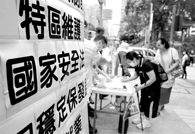 시위대 200명 체포 속 보안법 지지 서명 운동 중국의 ‘홍콩 국가보안법’ 제정 지지자들이 23일 홍콩 도심에서 ‘국가보안법이 홍콩 안정을 보장한다’는 문구를 내걸고 법안 찬성 서명 운동을 벌이고 있다. 24일 법안 반대 시위에 나선 반중파 홍콩 시민 중 약 200명이 경찰에 체포돼 홍콩의 긴장감이 높아지고 있다. 홍콩=신화 뉴시스