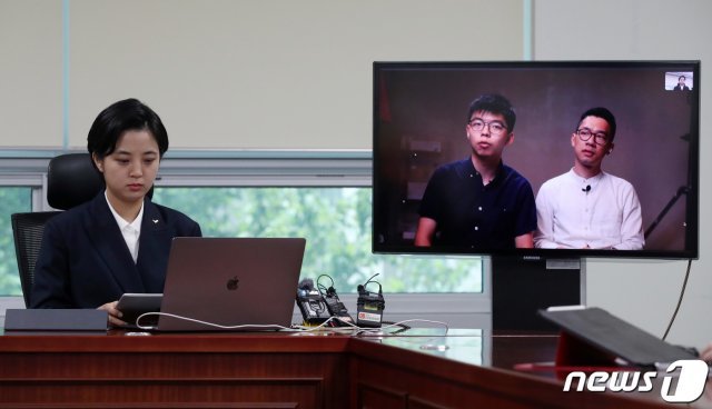 류호정 정의당 의원이 10일 서울 여의도 국회 의원회관에서 홍콩 민주화 투쟁을 주도하는 데모시스토당의 조슈아 웡 비서장(화면 왼쪽), 네이선 로 주석과 화상으로 회담을 하고 있다. 2020.6.10/뉴스1 © News1