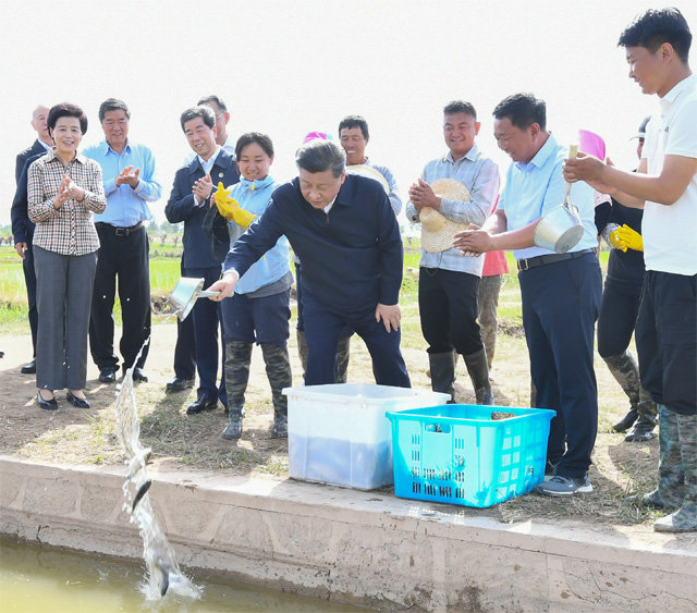시진핑 중국 국가주석(오른쪽에서 네 번째)이 9일 닝샤후이족자치구 내 인촨시를 시찰하고 있다. 코로나19, 미중 갈등 등으로 올해 중국 경제가 상당히 고전할 것으로 예상되는 와중에도 시 주석은 자신의 핵심 경제정책인 ‘샤오캉 사회(전반적으로 풍족한 사회)’ 건설을 강조했다.
