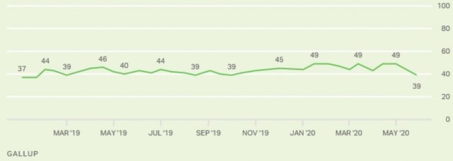 갤럽은 지난 5월 28일에서 6월 4일까지 진행된 대통령 국정수행 지지도 조사에서 트럼프 대통령의 지지율이 39%를 기록했다고 밝혔다. 이는 지난달 트럼프 대통령의 개인 최고치인 49%에서 크게 하락한 것이다.