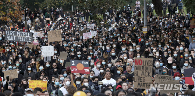 호주에서도 지난 주말 수천명이 백인 경찰의 폭력 진압으로 숨진 미국의 비무장 흑인 남성 조지 플로이드 사건에 항의하는 ‘흑인들의 생명도 소중하다’(Black Lives Matter) 행진에 참가했다.