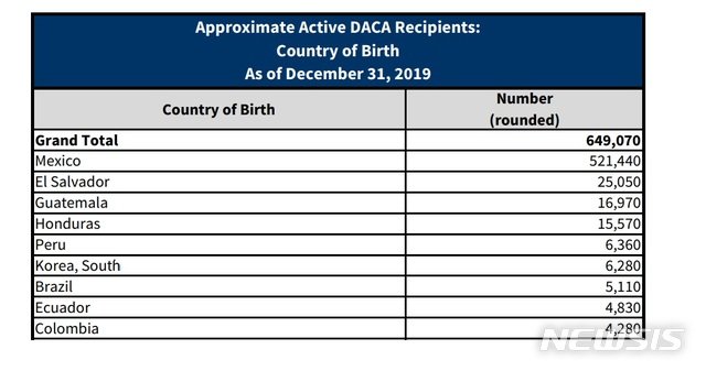 18일 미 시민이민국(USCIS) 통계 사이트에 따르면 지난해 12월31일 기준 다카 유효 수혜자(Active DACA Recipients)는 64만9070명이다.