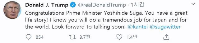 트럼프 대통령은 이날 “스가 요시히데 총리 축하한다. 당신은 멋진 인생 이야기를 갖고 있다!”고 트윗했다.