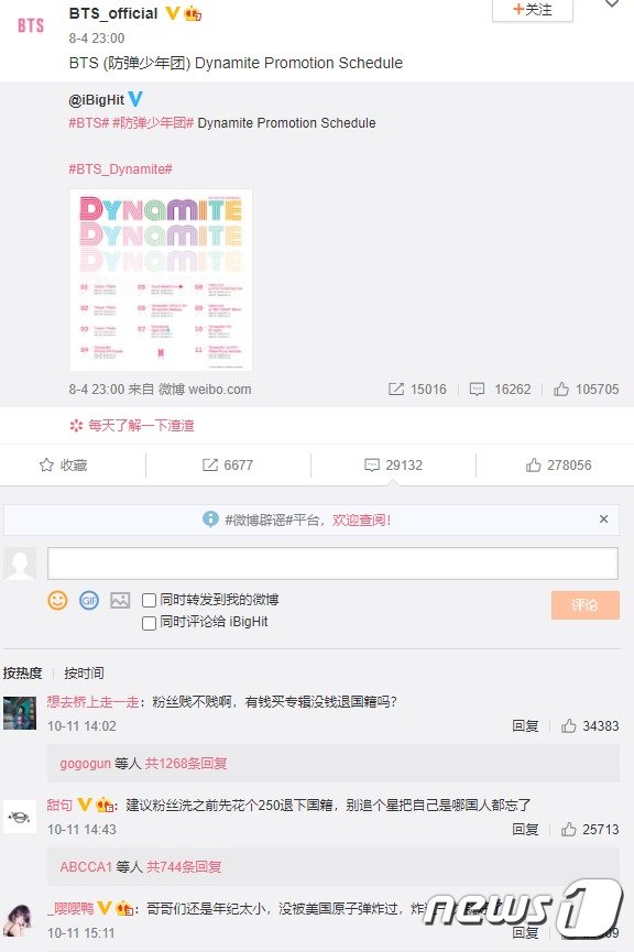 중국 누리꾼들이 방탄소년단(BTS)의 한국전쟁 관련 발언을 두고 분노하고 있는 가운데 BTS의 공식 웨이보(중국판 트위터)에 ‘욕설 테러’를 가하고 있다.