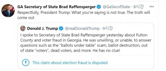 트럼프 대통령은 ‘수천 장의 투표용지가 폐기됐다’ ‘같은 표가 세 차례 집계됐다’ ‘사망자 이름으로 투표가 이뤄졌다’고 주장하며 “이런 형사 범죄가 일어나면 안 된다. 당신이 위험할 수 있다”며 위협성 발언까지 했다. 이어 “조지아 주민과 이 나라 국민이 (나의 대선 패배로) 화가 나 있다. 당신이 표를 다시 계산하겠다고 말하는 것은 잘못된 게 아니다”라고 주장했다. 자신이 조지아에서 졌을 리 없고 수십만 표 차이로 이겼다고도 했다.