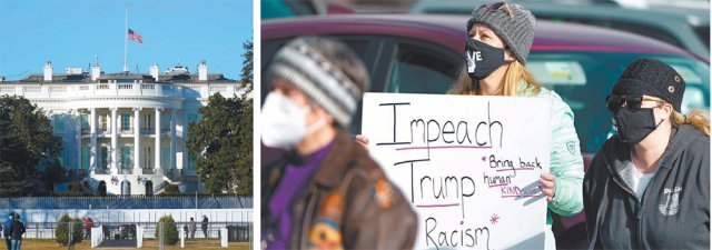 조기 내건 백악관… 美 곳곳서 ‘트럼프 탄핵’ 요구 시위 6일 도널드 트럼프 미국 대통령 지지자들의 의회