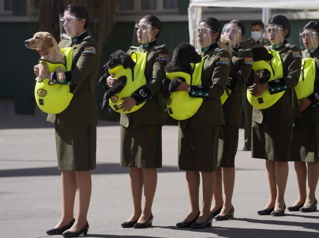 16일(현지시간) 볼리비아 라파스의 국립 경찰학교 운동장. 여경들이 새롭게 경찰견이 된 골든 리트리버(Golden Retriever) 강아지들을 소개하고 있습니다. 이 날은 개들과 전염병 치유의 수호자로 추앙받는 로크(St. Roch)성인의 축일입니다. 새로운 경찰견이 등장하면서 지금까지 활약했던 다른 경찰견들의 퇴역행사도 같이 했다고 합니다.
