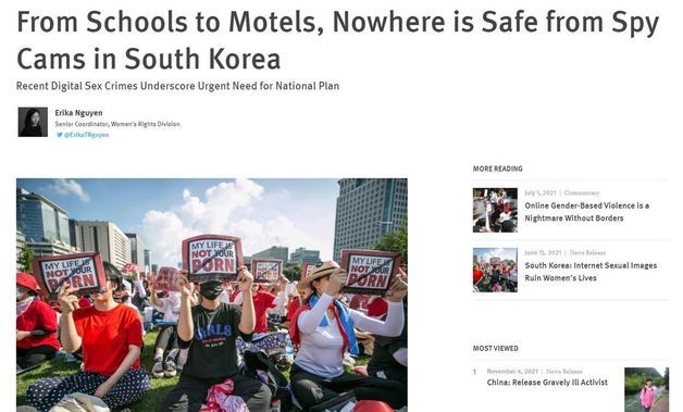 앞서 지난 6월 로이터통신은 휴먼라이츠워치가 한국의 디지털 성범죄를 다룬 보고서를 냈다는 소식을 전하며 “한국은 불법촬영의 전세계 중심지(global epicentre of spycam)”라고 보도한 바 있다.