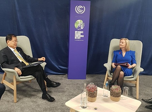 정의용(왼쪽) 외교부 장관은 1일(현지시간) 영국 글레스고에서 개최된 제26차 기후변화협약당사국총회(COP26)를 계기로 리즈 트러스 신임 영국 외교장관과 회담을 가졌다.(외교부 제공)