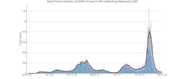 한편, 미국에서는 오미크론 파동에 따라 지난 1월 중순 일주일 평균 하루 확진자 수가 80만명을 돌파하다 최근 이 수치는 2만명대로 떨어졌다.