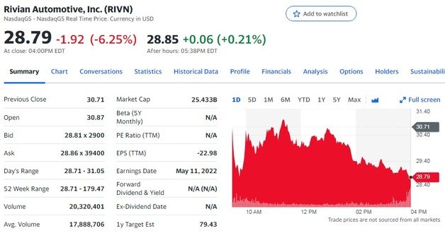 6일 현재 리비안의 주가는 주당 28.79달러를 기록하고 있다. 리비안은 지난해 11월 10일 뉴욕증시에 상장해 주가가 한때 172달러까지 치솟는 등 각광을 받았었다. 그러나 올 들어 월가에서 기술주 매도세가 본격적으로 출현하자 급락하고 있다.