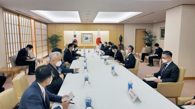 윤석열 대통령 당선인의 한일정책협의단 단장을 맡은 정진석 국회 부의장이 25일 도쿄 외무성에서 하야시 요시마사 외무상과 회담을 갖고 있다. (정진석 국회 부의장 페이스북) 2022.4.25/뉴스1