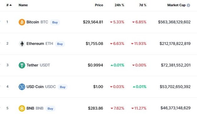 비트코인은 7일 오후 1시30분 현재(한국시간 기준) 글로벌 코인시황 중계사이트인 코인마켓캡에서 24시간 전보다 5.33% 급락한 2만9564달러를 기록하고 있다.