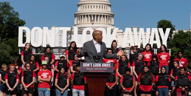코리 부커 민주당 상원의원이 6일 미국 워싱턴 의회 앞에서 학생들 주도로 열린 총기 규제 법안 촉구 집회에 참여해 발언하고 있다. 방탄복을 입은 학생들 뒤로 ‘외면하지 마세요(Don‘t look away)’라는 문구가 보인다. 지난달 텍사스주 유밸디 롭 초등학교에서 총기 난사로 초등학생 19명을 포함해 21명이 사망한 사건을 계기로 교내 총기 참사 대책을 마련하라는 여론이 거세지고 있다.