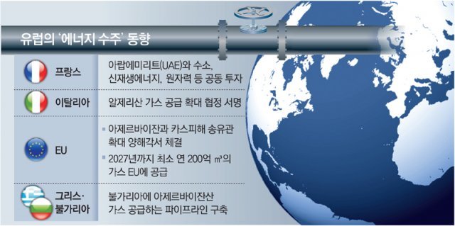 또 일간 르몽드에 따르면 에마뉘엘 마크롱 프랑스 대통령은 18일 아랍에미리트(UAE)와 수소, 신재생에너지, 원전 분야에 대한 양국 공동 투자 합의문에 서명했다. 경유 공급 관련 새 계약도 논의한 것으로 알려졌다. 마리오 드라기 이탈리아 총리도 이날 아프리카 최대 천연가스 수출국인 알제리를 방문해 가스 수송량을 20%가량 늘리는 협정에 서명했다고 미 월스트리트저널(WSJ)이 보도했다.