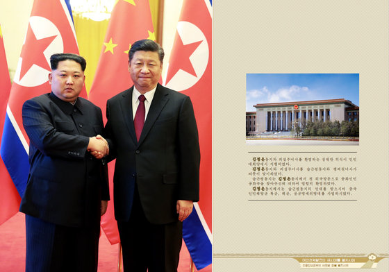 북한 외국문출판사가 12일 공개한 김정은 국무위원장 화보 ‘대외관계 발전의 새 시대를 펼치시어’. 김 위원장이 2018년 3월 중국을 방문해 시진핑 중국 국가주석과 악수하는 모습이 실려있다.(외국문출판사 화보 캡처) 2021.5.12/뉴스1