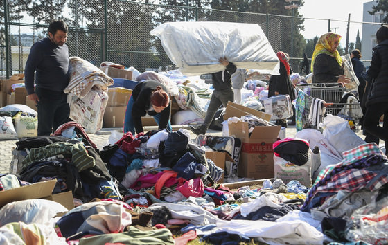 11일(현지시간) 튀르키예 이스켄데룬 시내 한 보급소에서 이재민들이 이불 등 생필품을 배급받고 있다. 2023.2.11/뉴스1 ⓒ News1