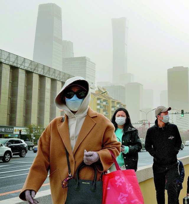 22일 중국 고비사막 등에서 발원한 황사로 수도 베이징의 공기 질이 최악 등급인 ‘6급(엄중 오염)’을 기록한 가운데 시민들이 마스크와 선글라스로 얼굴을 꽁꽁 싸맨 채 걷고 있다. 한국 기상청은 이 황사가 23일 우리나라로 유입되면서 서쪽 지역의 미세먼지 농도가 높아질 것으로 예보했다. 인천과 경기 북부가 미세먼지 ‘매우 나쁨’으로, 황사 위기경보 ‘관심’ 단계가 발령됐다. 서울 강원영서 충청 전북 등은 ‘나쁨’으로 예상되나 오후에는 일시적으로 ‘매우 나쁨’일 것으로 전망됐다.