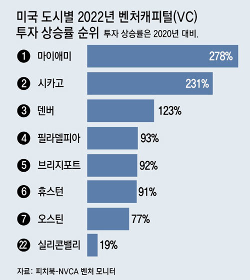 실리콘밸리 엑소더스 현상은 벤처캐피털(VC) 투자 수치로도 잘 나타난다. 미 스타트업 시장조사업체 피치북 데이터에 따르면 지난해 실리콘밸리에서 진행된 벤처투자 금액은 750억 달러(약 99조 원)로 마이애미(약 8조 원)보다 12배 이상 많았다. 하지만 벤처투자 상승률에서 큰 차이를 보였다. 마이애미에 투자된 금액은 2020∼2022년 278%나 늘었지만 같은 기간 실리콘밸리 벤처투자 상승률은 19%에 그쳤다. 지난해 실리콘밸리 투자액은 2012년 이래 가장 적었다.
