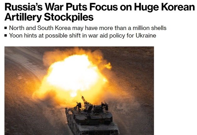 블룸버그는 한국이 만약 우크라이나에 포탄을 제공한다면 북한도 러시아에 포탄을 제공할 가능성이 크다며 전세계가 남북한을 주시하고 있다고 전했다.