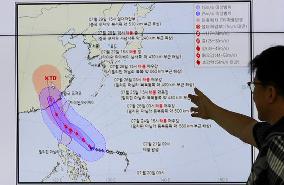 24일 전북 전주시 전주기상지청에서 예보관들이 제5호 태풍 ‘독수리’의 예상 이동 경로를 확인하고 있다. 2023.7.24/뉴스1