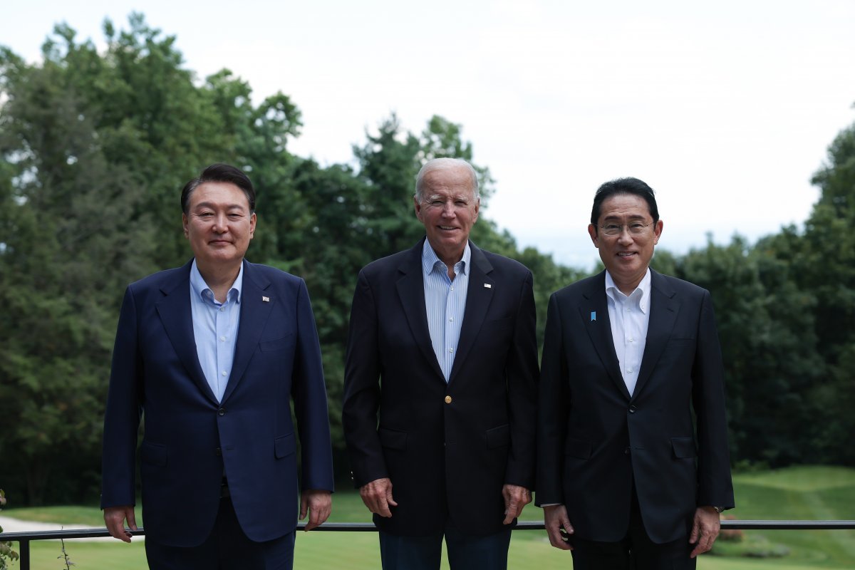 윤석열 대통령과 조 바이든 미국 대통령, 기시다 후미오 일본 총리가 18일(현지시간) 워싱턴DC 인근 미국 대통령 별장인 캠프 데이비드에서 열린 오찬에서 기념촬영을 하고 있다. 2023.8.19 대통령실사진기자단