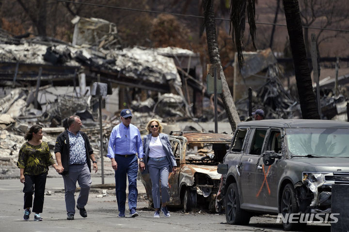미국 AP에 따르면 21일(현지시간) 바이든 대통령은 이날 질 바이든 여사와 함께 하와이 마우이섬 라하이나를 찾아 산불 피해 현장을 둘러보며 연방 정부 차원의 지원을 약속했다.