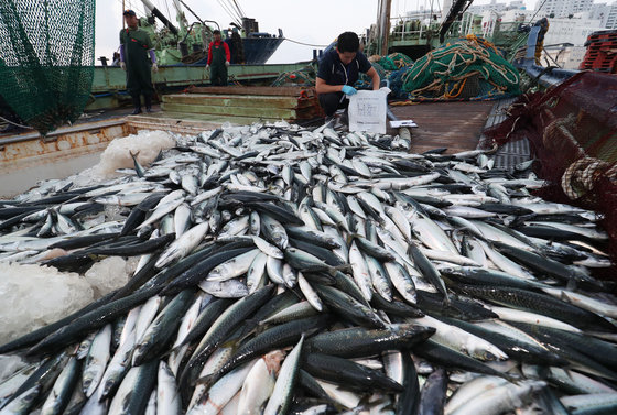 일본 후쿠시마 원전 방사능 오염수 방류가 하루 앞으로 다가온 23일 오전 부산 사하구 부산시수협 다대공판장에서 방사능 검사 요원이 수산물 신속 검사를 위해 어선에 올라 시료를 채취하고 있다. 정부는 24일 개시되는 일본 후쿠시마 원전 방사능 오염수 방류에 대비해 국내 위판 물량의 80%를 점유하는 전국 43개 위판장에서 민간 검사 인력을 활용해 수산물 유통 전 검사가 완료되는 방사능 신속 검사를 실시하고 있다. 2023.8.23/뉴스1