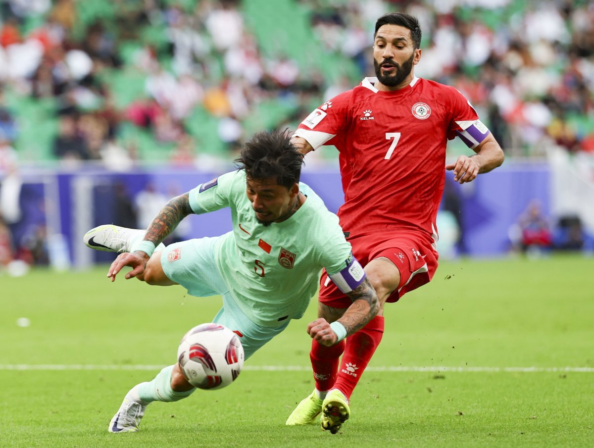 17일(현지시간) 카타르 도하 알투마마 스타디움에서 열린 2023 아시아축구연맹(AFC) 카타르 아시안컵 A조 조별예선 2차전 레바논과 중국의 경기 전반 레바논 주장 마툭과 중국 주장 장린펑이 볼 경합을 하고 있다. 2024.01.17. 도하(카타르)=뉴시스