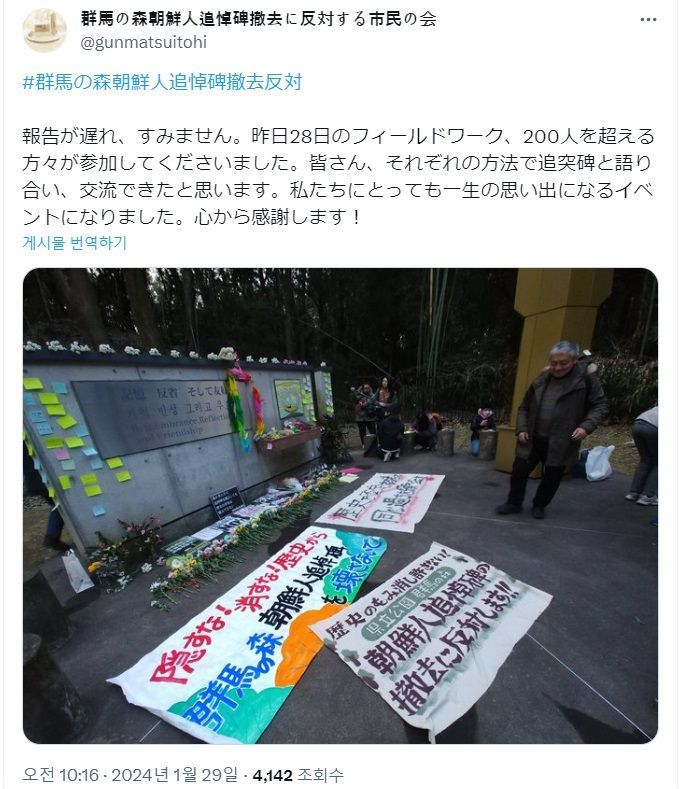 일본 군마(群馬)현 당국이 현립공원에 설치됐던 ‘강제동원 조선인 추도비’를 철거했다고 인정했다.
