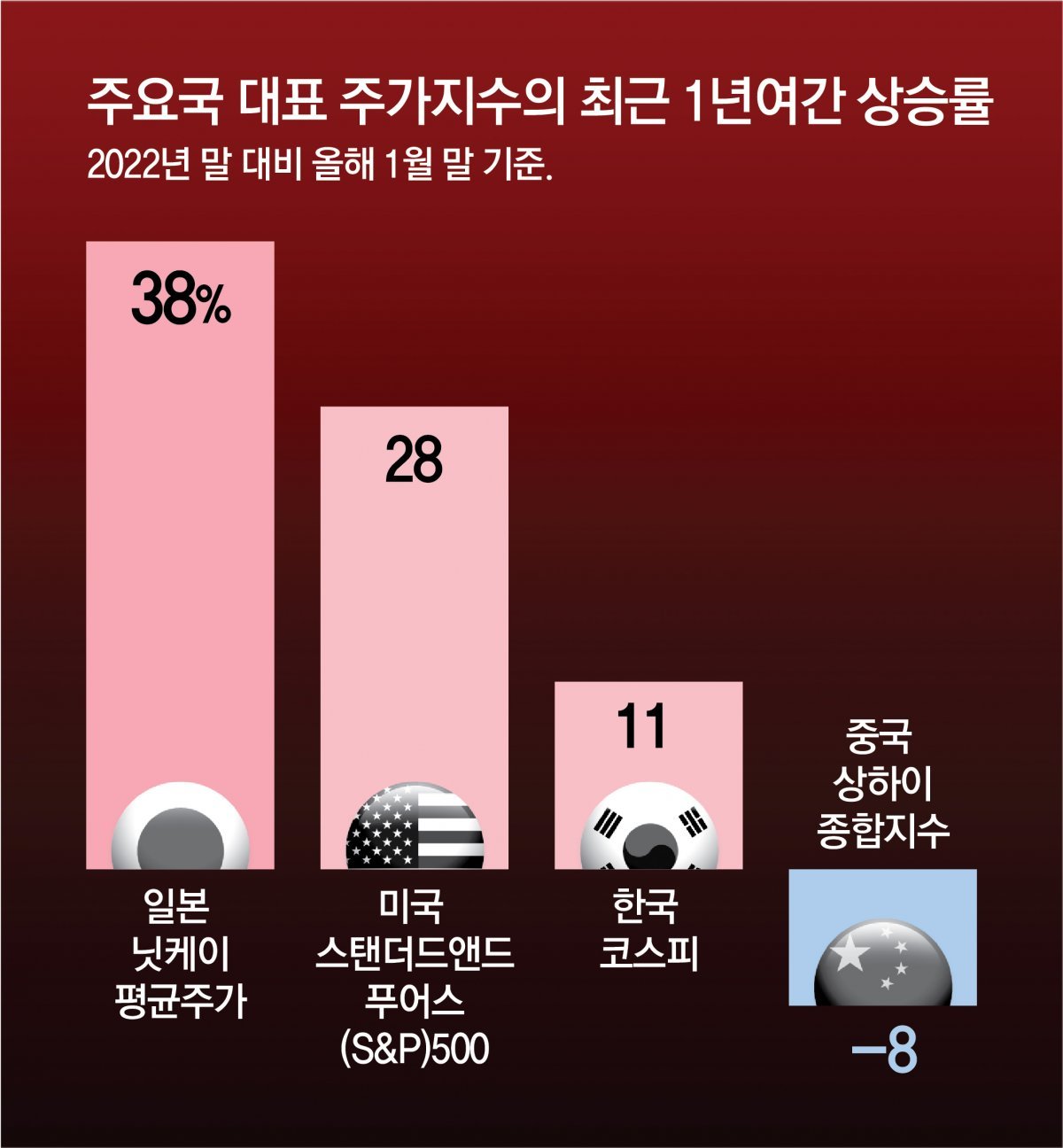 세계 증시의 2022년 말 종가 대비 올해 1월 말 상승률을 보면 이는 뚜렷이 드러난다. 닛케이주가는 38%로 미국(스탠더드앤드푸어스500 기준 28%)이나 한국(코스피 11%)보다 훨씬 높았다. 중국(상하이종합지수)은 같은 기간(13개월) 동안 오히려 8%나 하락한 것과 비교하면, 일본 증시의 상승은 놀라울 정도다.