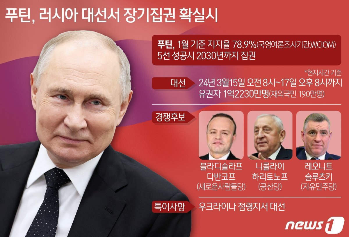 블라디미르 푸틴 대통령(71)의 5선(選)이 확정될 것으로 확실시되는 러시아 대선이 오는 15일부터 사흘간 실시된다.