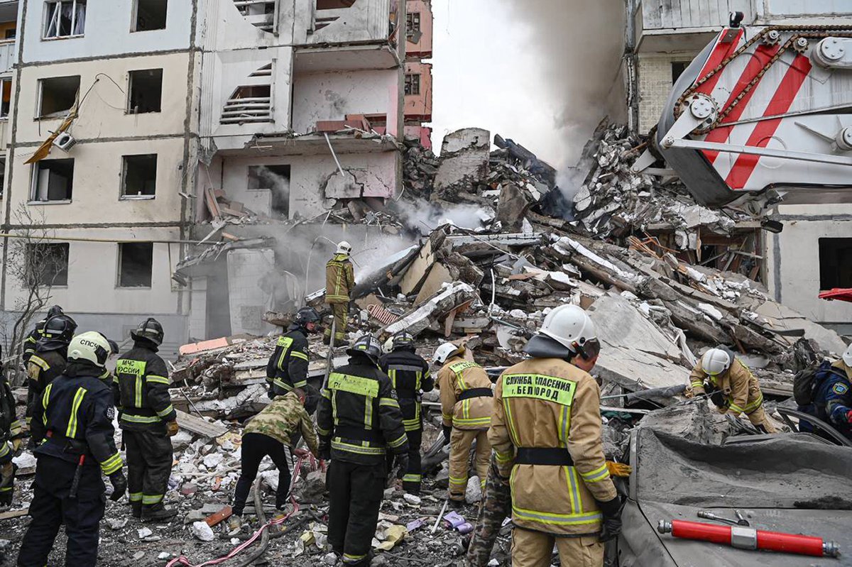 구조대원들이 우크라이나의 공격으로 무너진 아파트에서 구조 작업을 벌이고 있다. 러시아 측은 이번 공격으로 현지 시간 오후 3시