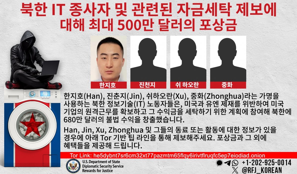 미국 국무부가 미 회사에 위장 취업해 680만 달러(약 92억 원) 이상을 벌어들인 북한 ‘외화벌이’ 정보기술(IT) 종사자들에 대해 최대 500만 달러(약 67억 원)의 현상금을 걸고 공개 수배에 나섰다.