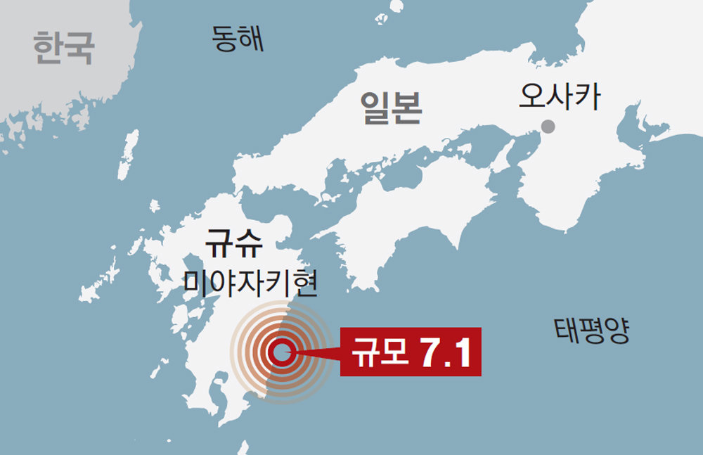 일본 남서부 규슈의 미야자키(宮崎)현 앞바다에서 8일 오후 4시 43분경 규모 7.1의 지진이 발생했다. 이번 지진은 올해 1월 1일 발생해 320명의 사망자가 나온 이시카와(石川)현 노토(能登)반도 지진(규모 7.6)에 이어 올해 들어 2번째로 큰 규모다.