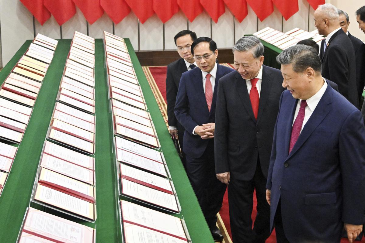 시진핑(오른쪽) 중국 국가 주석이 14일(현지 시간) 베트남 하노이의 당 중앙위원회 청사에서 또 럼 베트남 공산당 서기장과 회담을 마친 후 함께 양국 간 체결했던 협정서 사본을 들러보고 있다. 2025.04.15. 하노이=AP/뉴시스