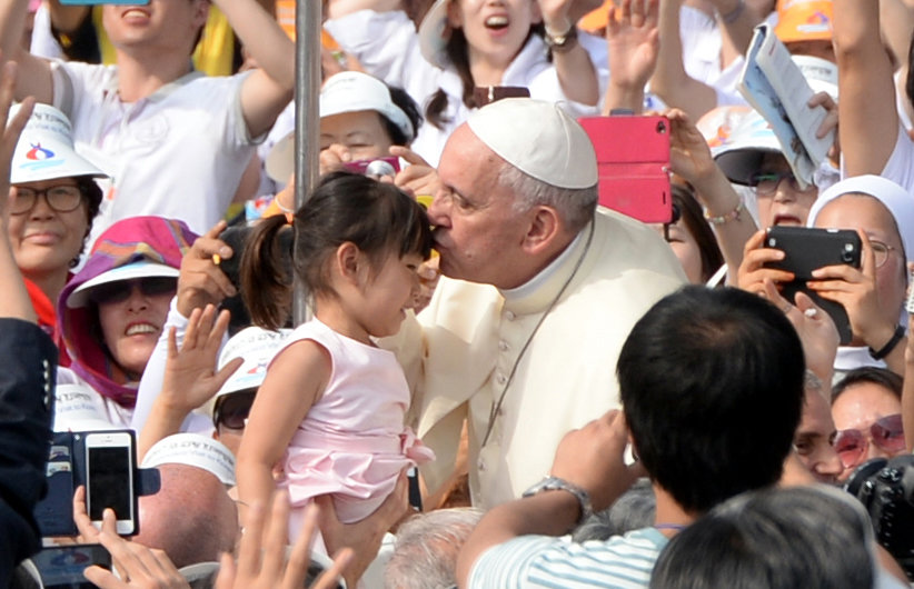 프란치스코 교황이 서울 광화문 광장에서 열린 ‘윤지충 바오로와 동료 순교자 123위 시복 미사’를 집전하기위해 오픈카를 타고 이동하며 언린이 이마에 뽀뽀를 하고 있다. (사진공동취재단) 2014.8.16/뉴스1
